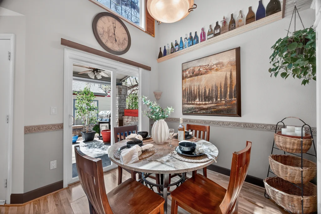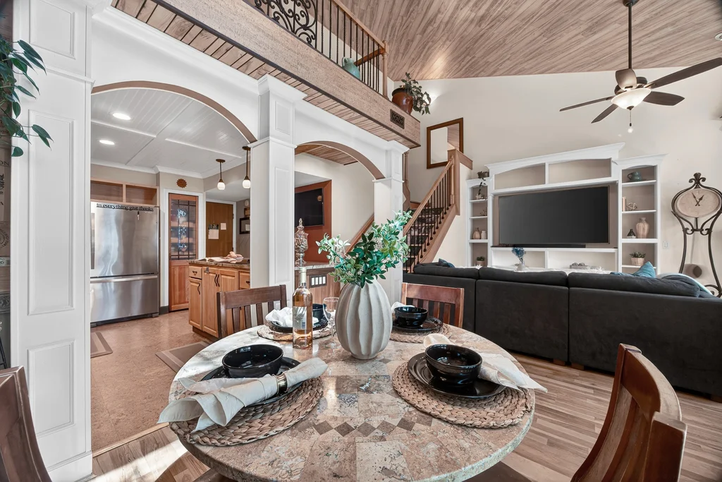 The open dining area connects seamlessly to the covered patio with ceiling fan—ideal for indoor/outdoor dining and entertaining.
